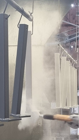 En troisième étape, on applique une couche de finition en poudre polyester qui elle aussi est thermolaquée.